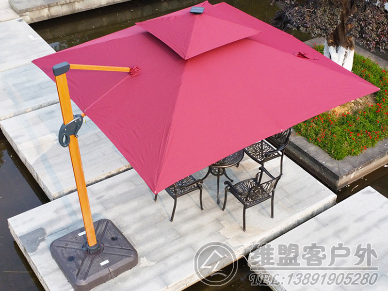 户外遮阳伞系列 采用全铝质框架与进口Sunbrella面料,具备8年以上抗紫外线褪色性能,支持摇把双向止滑、360°伞面调节与脚踏式角度控制,设计源自欧洲主流市场,被称作“户外伞中的劳斯莱斯”。 产品类型包括:直杆缩折吊伞、罗马伞、岗亭伞、执勤伞、广告促销伞等。